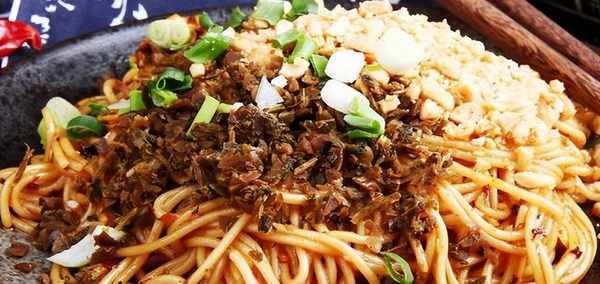 宜賓燃面屬於四川省宜賓市的一種傳統名小吃,這種面食主要是用面條,油炸花生,辣椒,黃芽,蔥,鹽,味精等食材制作而成,做好的燃面,吃著香辣可口,很鮮美,色澤松散紅亮。