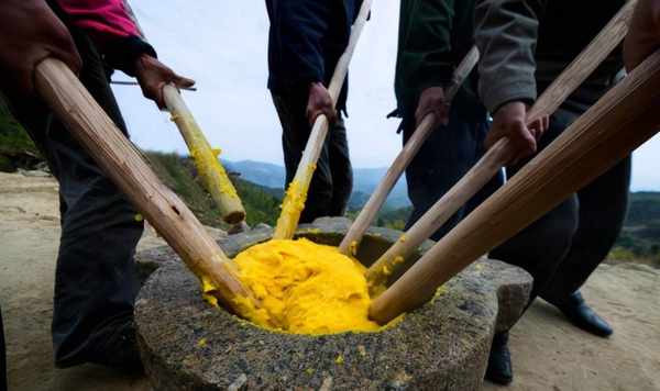 接下來,蒸好的黃暇需要用木棍搗成“糍”,也就是人們所說的“打糍粑”。過去,崇義一有哪傢打黃元米果時,總會叫上幾個同村的人來一起打,七八個人圍著石臼,用長長的木棍敲打著金黃的飯團,伴隨著一聲一聲有節奏的吆喝聲,飯團被木棍搗成富有韌性的糍粑。歷經捶打才能換來金色的果實,這是黃元米果教給崇義人的道理,也是黃元米果帶給崇義人寶貴的精神財富。