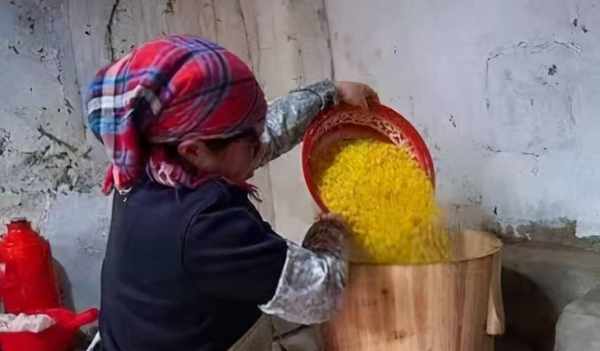和瞭黃堿的米飯叫做“黃暇”,冒著香噴噴的霧氣黃暇金燦燦的,非常誘人。但是你可別急,黃暇還需要裝入木甑中再蒸一次,讓米飯充分染色。