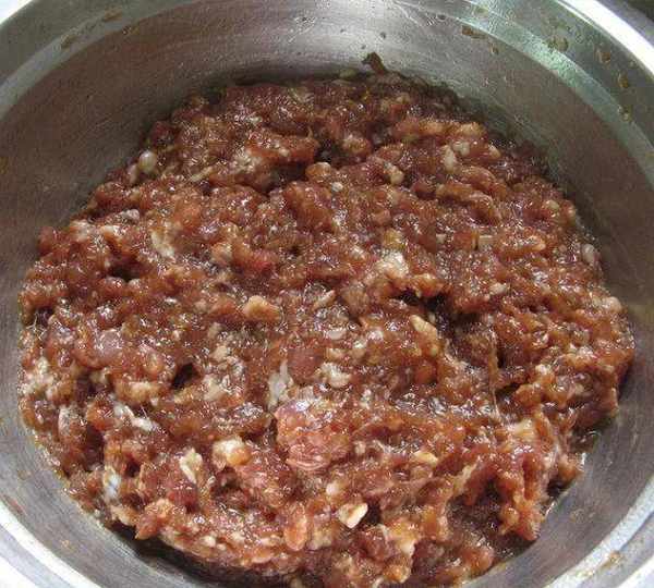 步驟2:肉餡放入容器中,然後分三次加入溫水打餡兒,順著一個方向攪拌,中間試下味道,再加入一些鹽,打到軟黏程度即可。