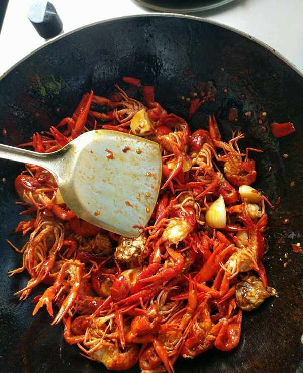 第四:小龍蝦不用過油,直接下鍋煮,加入炸好的花椒、胡椒、幹辣椒拌勻。