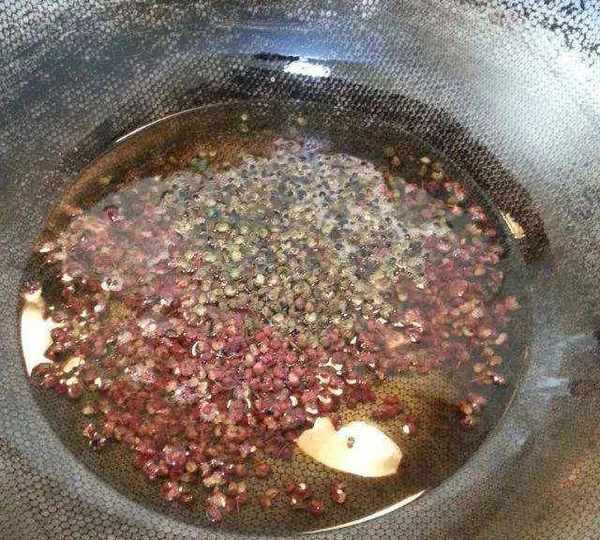三:熱鍋熱油,放花椒、胡椒煸出香味麻味,撈出,倒幹辣椒炸香撈出,放香葉、蔥薑蒜炒香,炒香後加入碎豆豉、辣椒面、豆瓣、再次炒香,烹入料酒生抽,加開水,煮開,把香味都融在湯裡,料渣撈出。