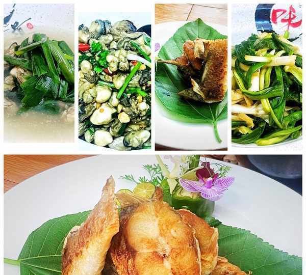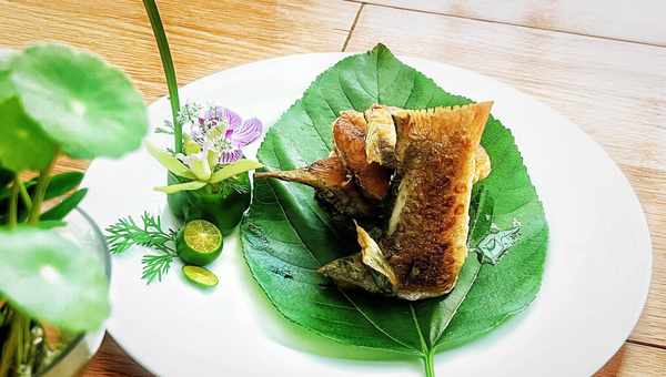 四:裝盤時要休息,最好選用白色平底圓碟,碟底可根據就地取材選擇選用大一點的綠色植物葉(桑樹葉,芭蕉葉等皆可)平鋪,將煎好的馬友魚放置於上,再根據需求配搭時令植物和小花,色彩搭配以和諧襯托為本。