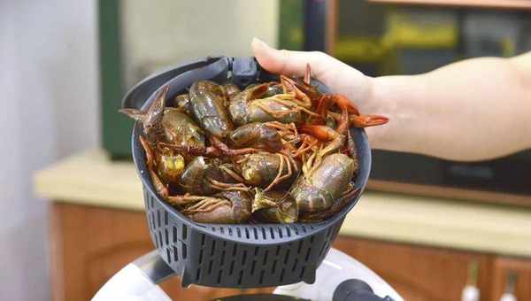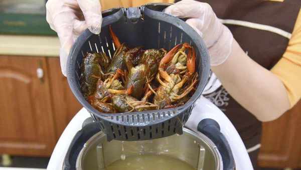 1.將處理幹凈的小龍蝦放入小美網鍋中,加入沒過小龍蝦的水,以10分鐘/50℃/速度5清洗,再用清水沖洗幹凈,放在一旁晾幹水分備用;