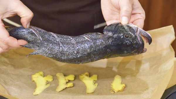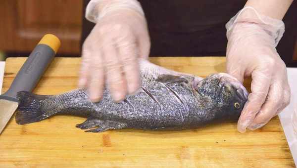 1.將清理幹凈的魚兩面劃上幾刀,表面撒上少許鹽,用手揉按均勻,再將魚肚中塞入蔥段、薑片;