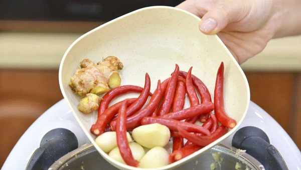 3.蒸好之後將魚擺入盤中,再將50g小米椒、20g蒜、5g薑,一起加入小美主鍋中,蓋上主鍋蓋和量杯蓋,以12秒鐘/速度5打碎,並將鍋壁的材料整理到底部;