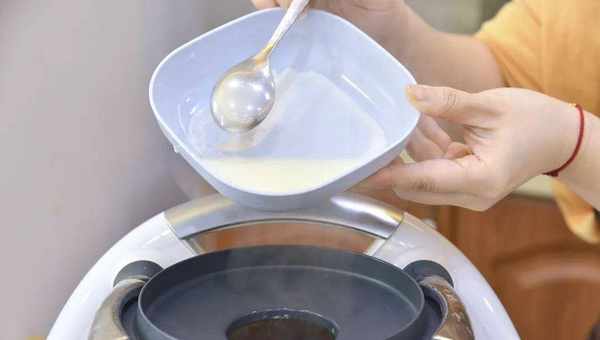 7.烹煮時間還剩2分鐘時,將芡汁材料混合均勻後從鍋蓋孔加入,速度調成反轉速度1;