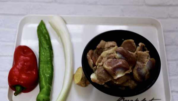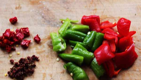 5、把青尖椒和紅尖椒都清洗幹凈,切成辣椒段備用。