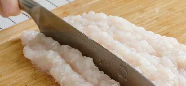 1、刀魚洗幹凈並瀝幹水分,用小刀慢慢刮下魚肉,魚頭魚骨用紗佈袋裝好留做湯。