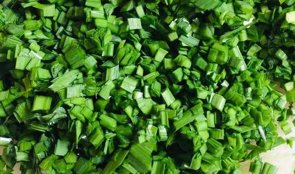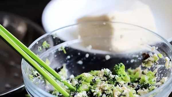 3、韭菜摘去黃葉之後清洗幹凈,切成細末,加少許的白砂糖和鹽,攪拌均勻,出水後瀝去水分,再放入切碎的肥膘肉末、蝦茸和魚茸用筷子把它們混合均勻。