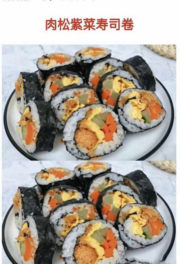 食材:米飯2碗,雞蛋2個,青瓜半根,胡蘿ト半根,紫菜4片,肉松,沙辣醬,油,鹽。