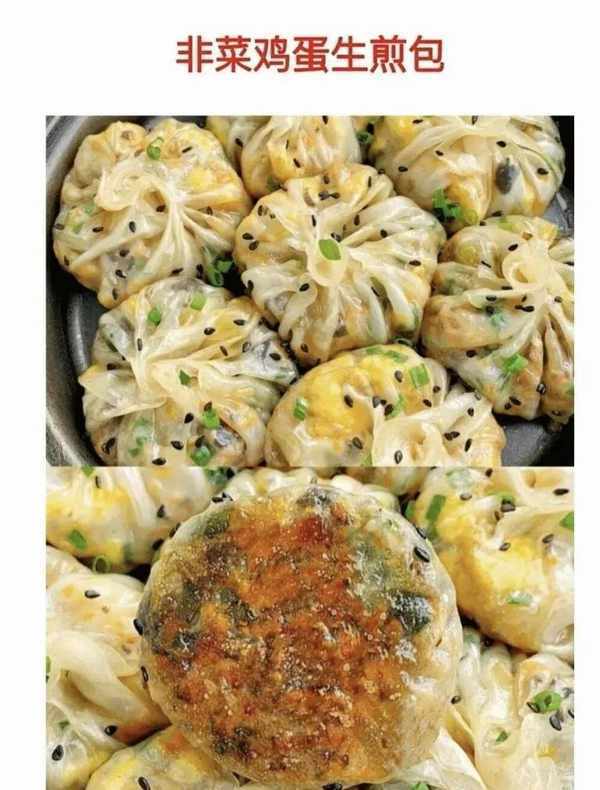 3.餃子皮搟薄,包入調好的餡兒,捏成包子狀,鍋裡刷油,放入包子,煎到底部金黃,加入半碗水,蓋上蓋子燜6分鐘,撒上芝麻,也可以放入鍋中大火蒸8分鐘