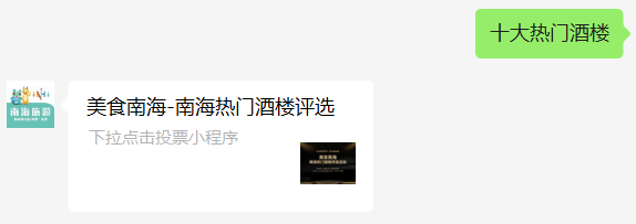 ①關註“南海旅遊”微信公眾號,在後臺輸入“十大熱門酒樓”。
