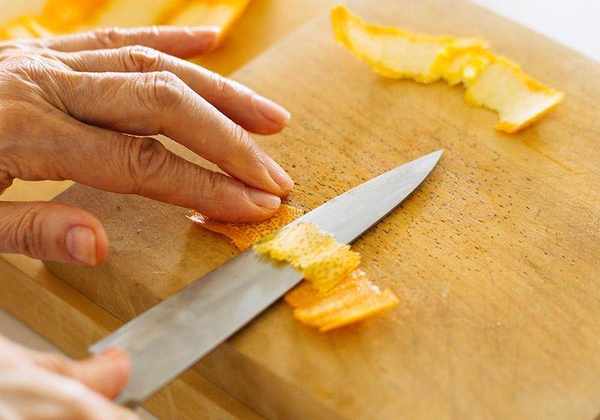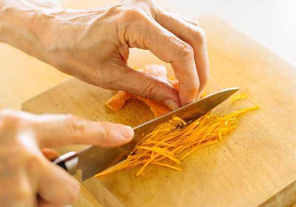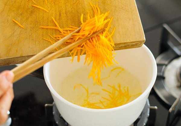 2、將橙皮削去,切成絲,快速煮沸,保持幹燥。 將果肉切成 2 厘米長的塊,留汁。