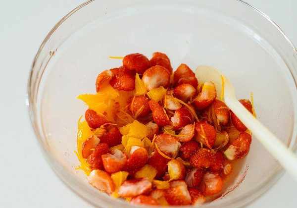 3、在一個密封的罐子裡,加入混合的草莓、A、橙皮、果肉和果汁,然後加入青椒。 將它們疊成 3 層並放置過夜。 之後,它可以在冰箱中存放1-2天。