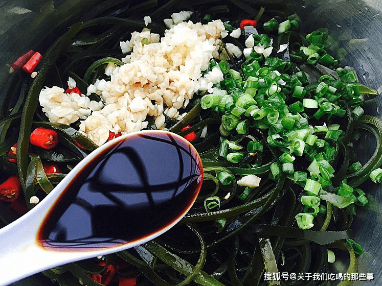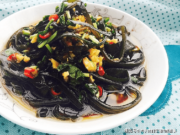 2、鍋裡倒入適量油燒熱,把蒜末、蔥花、香菜末、小米椒放在海帶上,潑入熱油熗出香味,加入適量食鹽、生抽、香醋、香油,最後將調料與海帶拌均勻既可。