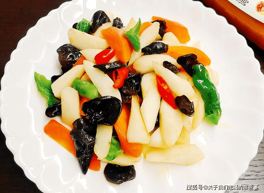 1、黑木耳提前用水泡發,洗幹凈備用。山藥去皮後洗幹凈,切成薄片用水浸泡。青椒、紅椒去蒂,洗幹凈後切片。胡蘿卜去皮洗幹凈,切成薄片。