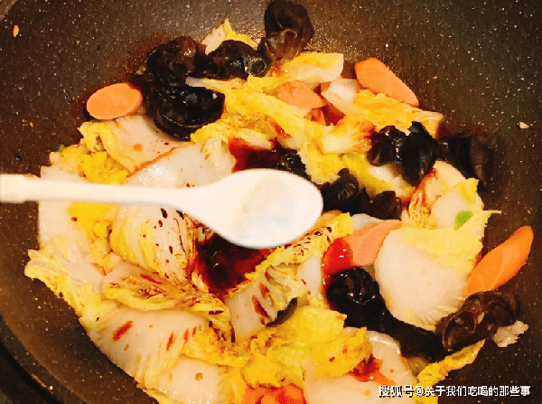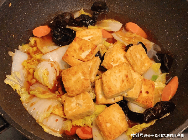 3、白菜葉變軟後加入適量生抽、老抽、蠔油,翻炒均勻後放入豆腐塊,加入適量開水沒過食材,加入適量鹽,小火燉5分鐘,淋入水淀粉,煮至濃稠即可出鍋!