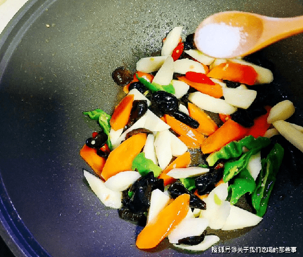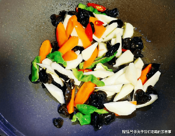 3、鍋裡倒入食用油,燒熱後放入蒜末爆香,倒入木耳、胡蘿卜片、山藥片,大火翻炒1分鐘,再放入青紅椒炒一分鐘,食材全部熟透後加入食鹽、雞精調味,即可關火出鍋。