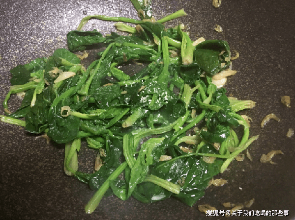 2、起鍋燒油,放入蒜片爆香,倒入蝦皮翻炒一會兒,變色好後倒入菠菜,大火翻炒1分鐘,加入適量食鹽、雞精,翻炒均勻後即可出鍋。