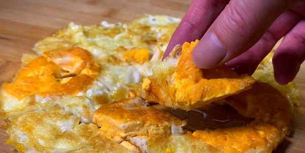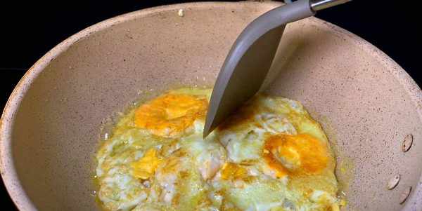2.碗中打入三個雞蛋,鍋內倒入適量的油,油熱後倒入雞蛋,中小火慢煎,將底面煎至定型,晃動鍋,使其受熱均勻,煎至底面煎黃,翻面,兩面煎至金黃後,盛出放在案板上,切成菱形塊備用。