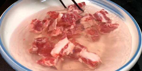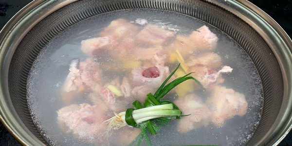 3.排骨浸泡好後,再用流動的清水洗凈,排骨洗凈後冷水下鍋,加入蔥結和薑片、少許黃酒,中小火慢慢煮開,煮開後,用勺子將浮沫撇出,然後再煮上兩分鐘,兩分鐘後撈出放入溫水中,把表面的浮沫清洗幹凈,洗凈後裝入盤中備用。