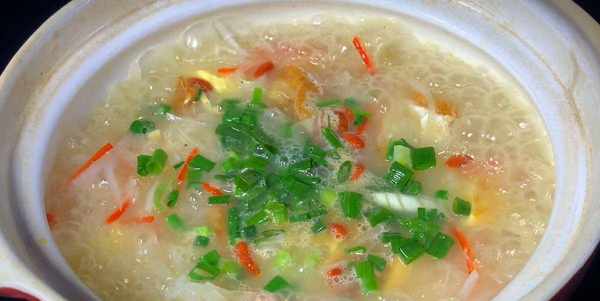 5.1個小時後,鍋內加入一勺食鹽、適量的雞精、一點胡椒粉,中小火再煮1分鐘,一分鐘後再加入枸杞,再撒上蔥花,就可以食用瞭。