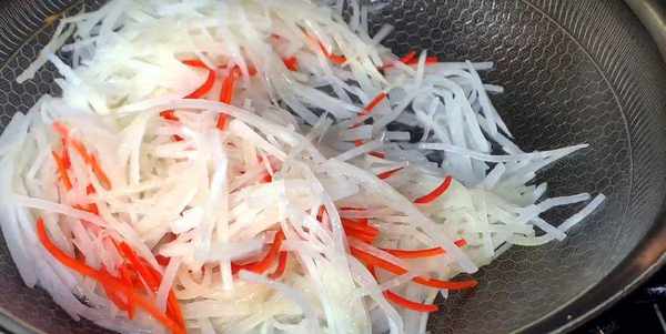 3.鍋內加入適量的豬油,油熱後倒入蘿卜絲,大火快速翻炒,將蘿卜絲炒香,將蘿卜絲炒軟炒熟,倒入紅椒絲,繼續翻炒均勻。