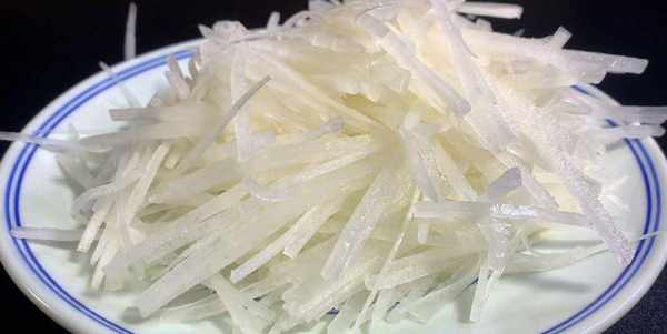 1.準備半根蘿卜,削去外皮,切成細絲,切好後裝入盤中備用,紅椒去蒂去籽切成細絲、小蔥切成蔥花,全部切好後裝入碗中備用。