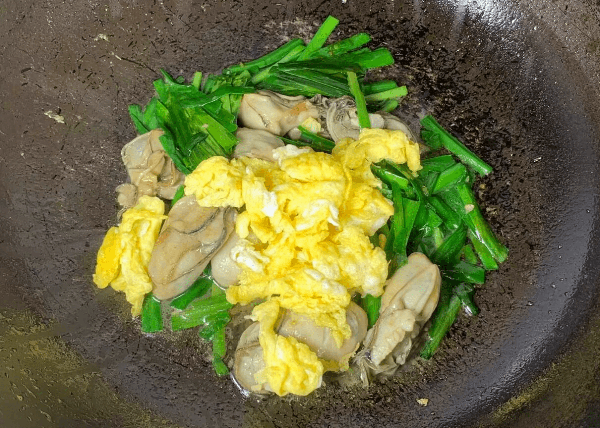 4、最後把韭菜段倒入,加入少許的蠔油、少許的味極鮮和少許的鹽翻炒均勻,關火後把雞蛋碎倒入,翻拌均勻,出鍋前滴入幾滴香油,攪拌一下盛出來即可。