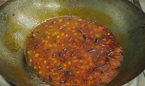 5、鍋洗凈燒油,放蔥薑蒜片、幹辣椒、麻椒,一塊小火爆香,加兩勺豆瓣醬炒化,炒出紅油,再來一塊火鍋底料,豆瓣醬和火鍋底料是在傢做血旺最簡單、最出味的兩種調料。