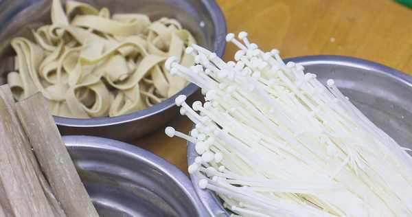 2、素菜:金針菇切去根部後打散,空心菜洗幹凈切成段,大蔥切蔥花,大蒜拍扁切末,再準備適量的寬粉、千張、黃鱔備用。