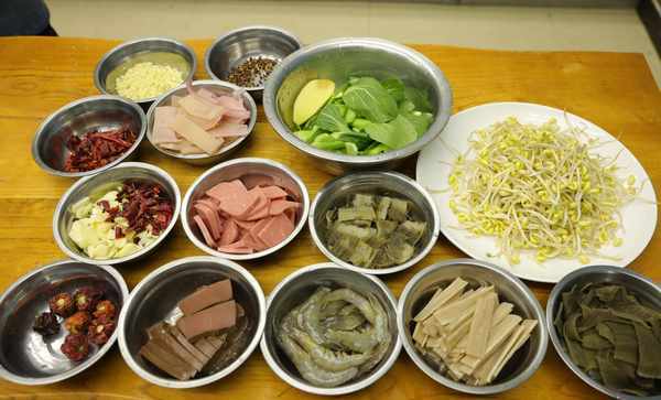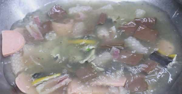 1、葷菜:把魷魚筒上的黑膜揭掉,用清水洗幹凈,適量的肚撕成片,多淘洗幾遍,去除粘液和雜質,黃豆芽再用清水洗一遍,鴨血切成片,魷魚筒切成小塊,肚也切成塊,半個火腿切成片。