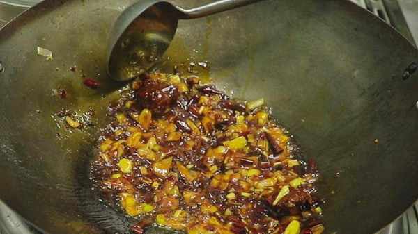 9、鍋裡加菜籽油,再倒點紅油,一塊加至兩百度,起鍋,放蒜末、麻椒、接著是二荊條、燈籠椒,一定要註意好先後順序,炸香以後澆到菜上即可。