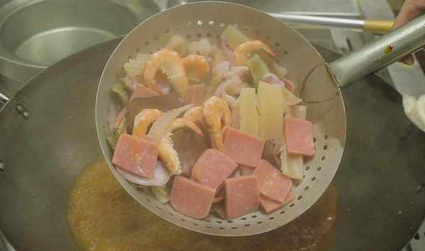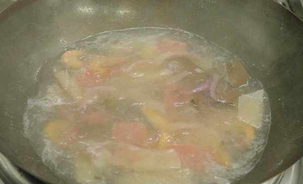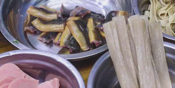 4、然後放入黃鱔段、魷魚、火腿、鴨血,繼續大火煮至沸騰,撈出來控水,這一步主要是為瞭去除腥味和雜質。