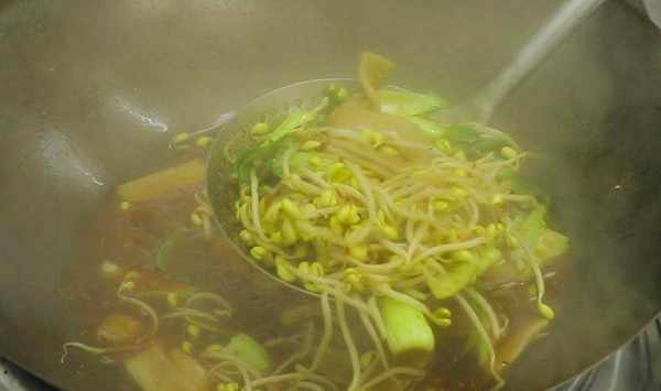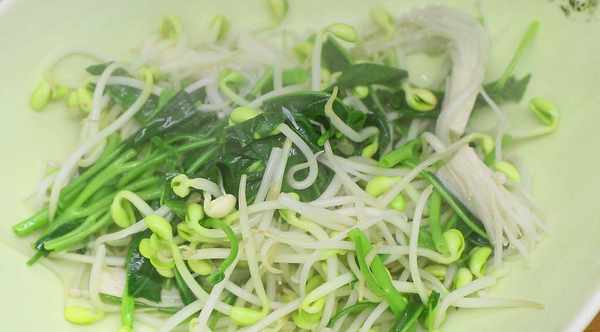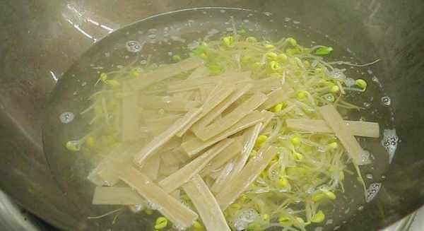3、燒半鍋開水,先放黃豆芽汆燙半分鐘,去去豆腥味,然後把川粉也放進去,稍微煮軟一些就管出鍋瞭。並用清水沖沖,省的粘一塊。