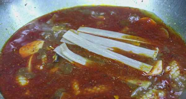 6、然後挑出鍋中的香葉和桂皮,倒入黃鱔,魷魚,鴨血,火腿和寬粉煮兩分鐘,這幾樣食材比較難煮,要早一點下鍋。