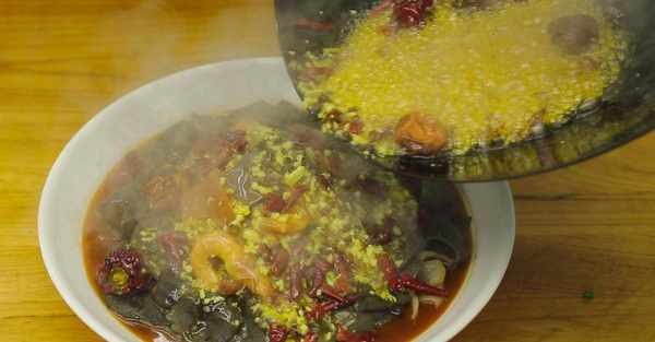 8、最後撒上蒜末,粗辣椒面,蔥花和一小撮花椒,等待激油。鍋內倒入辣椒紅油和麻椒油,燒至七成熱時起鍋,均勻澆在小料上面,激出香味,美味即成。