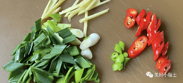 3.蒜苗斜著切,這樣更容易入味,可以來點青紅辣椒搭配,薑片切絲,可以再切點蔥段提味。