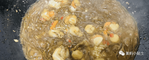 6.然後把粉絲放進去,用筷子攪拌一下,再加入剛調好的料汁,開中火,煮大概兩分鐘,入味收汁以後就可以出鍋瞭,再撒上點蔥花,真的太香瞭。