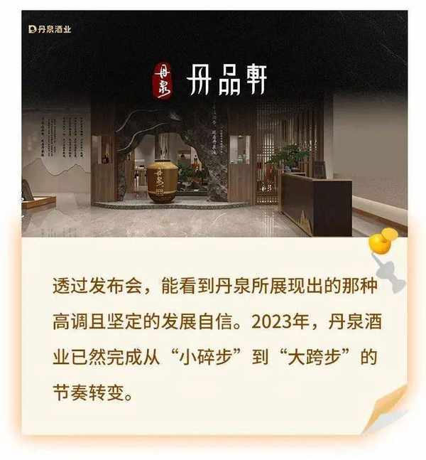3月27日,由丹泉價值營銷顧問李學主講的“開創白酒價值營銷——2023丹泉體驗館發佈會”上,丹泉新一代體驗館丹品軒就此發佈。能以“開創白酒價值營銷”這句話為主題,也看得出2023年丹泉酒業要高調起來瞭!
