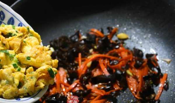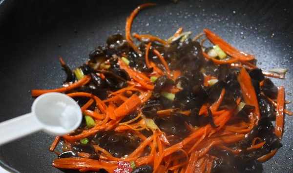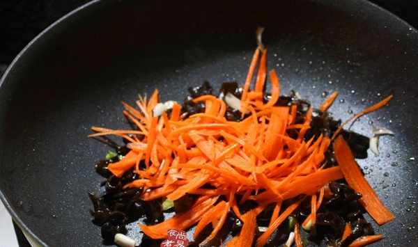 熱鍋,繼續倒入適量食用油,將蔥頭部分炒出香味,再倒入黑木耳和胡蘿卜絲,保持大火翻炒十幾個來回;