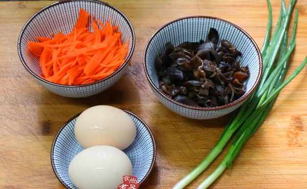 【食材】土雞蛋2個、黑木耳20克、小蔥2根、胡蘿卜50克、食用油適量、鹽3克、雞粉1克
