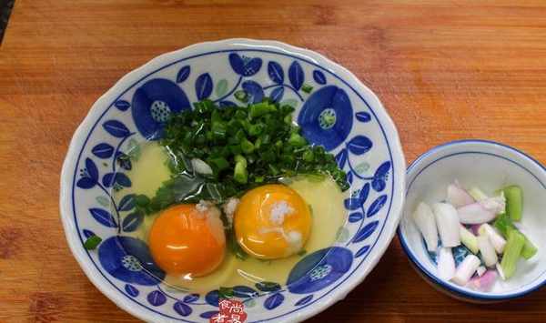 小蔥分開頭尾切碎,雞蛋打入碗裡,放入蔥葉,調入少許鹽攪拌成均勻的蛋液;