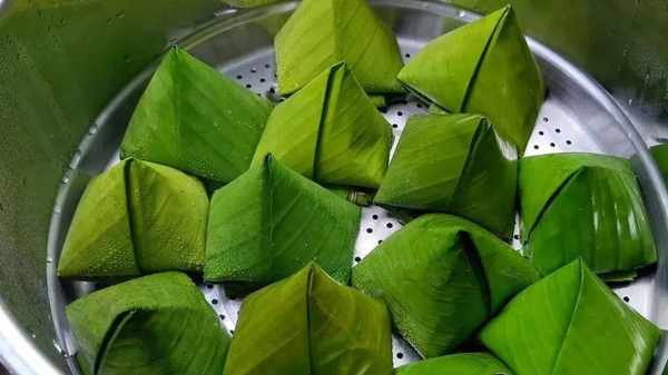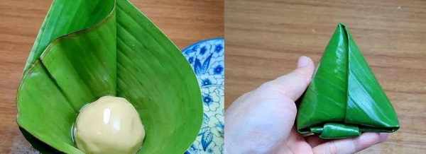 5、接著準備一些香蕉葉,將它卷起來,放入做好的團子,折疊包裹起來,變成三角形。