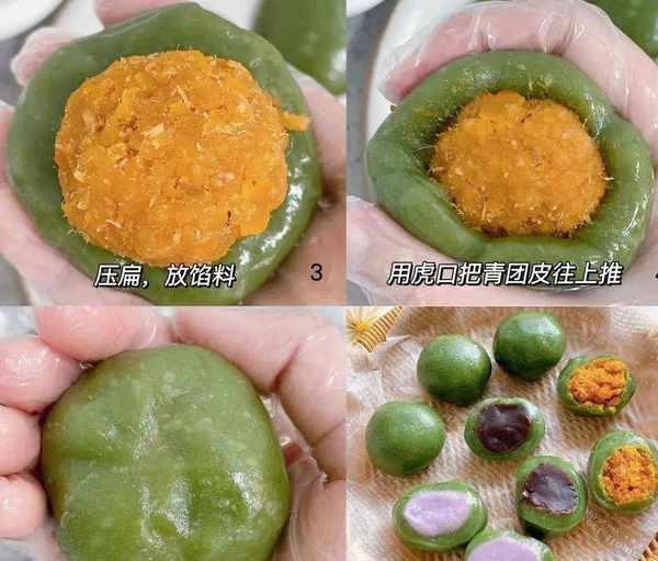 4、包裹好的青團,可以直接吃瞭,口感清甜香軟,有一股艾草的香味,吃起來糯嘰嘰的,自己在傢做健康衛生,比外面買的好吃。