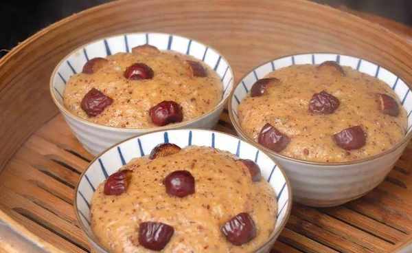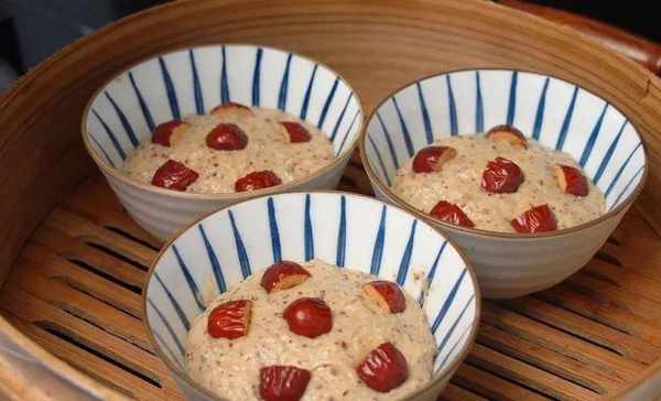 3、準備3個飯碗,碗底刷一層油,倒入面粉,表面點綴一些紅棗,然後熱水上鍋蒸12分完成。