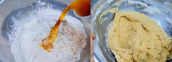 1、準備1斤糯米粉,加少許紅糖,紅糖用熱水融化,然後倒入糯米粉中。將糯米粉和紅糖水混合,變成面團。