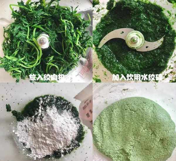 2、接著將艾草倒入榨汁機,攪碎成汁水,混入糯米粉,攪拌成綠色面團。