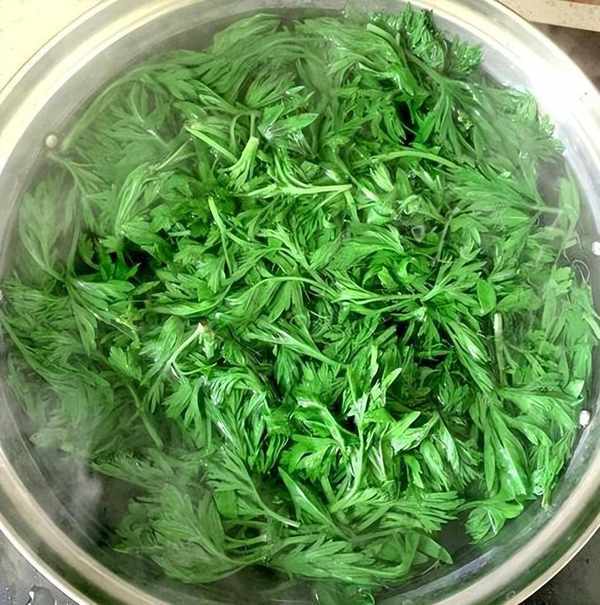 將艾草摘幹凈,洗凈,可以適當切的短一些,控幹水分,沒有明顯滴水就可以瞭。